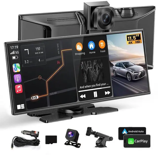 Extra Large 11.5 Inches Display ScreenThis HD 11.5" screen for car is compatible with both A-pple Carplay and Android car systems, making it one of the largest in car entertainment solutions on the market, providing a more stunning visual experience. Compared to traditional small screens, the ultra large touch screen has more operational advantages, and adopts a low reflection design, with a lower installation position to avoid obstructing the driver's line of sight and improve driving safety. ^^ Mobile Phone App View The portable screen for car can be connected to a mobile app, making it more convenient and efficient to view recorded videos.