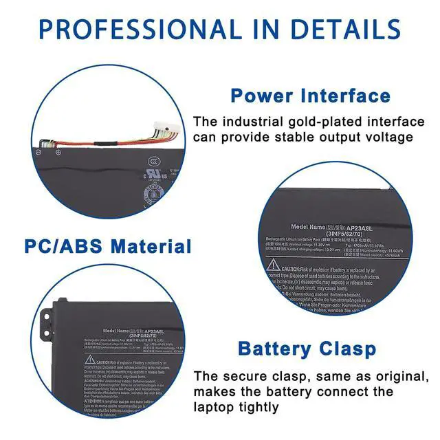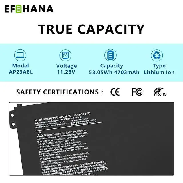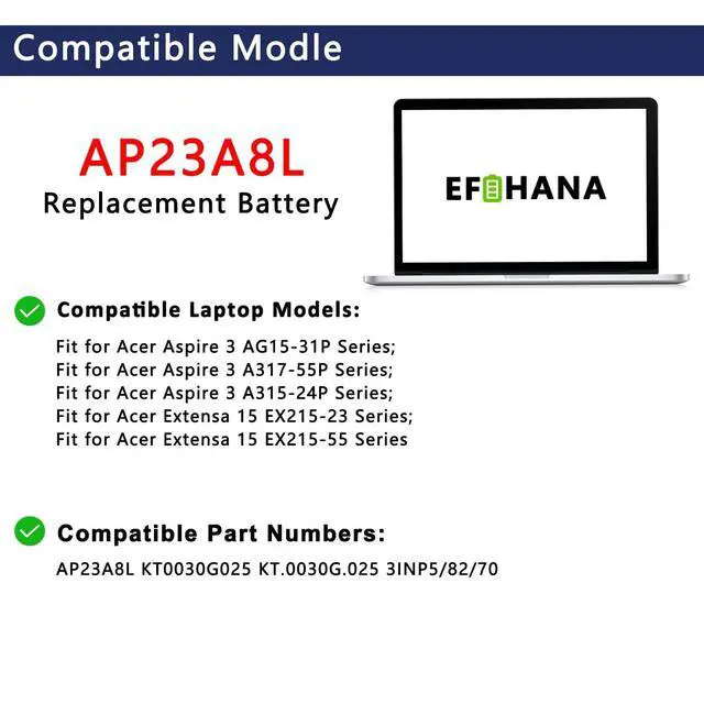 Capacity: 4703mAh/ 53.05W h // 100% New from Manufacturer. Top circuit boards and smart chip. ^^ Compatible Part NumberAP23A8L KT0030G025 KT. 0030G. 025 3INP5/82/70 ^^ Compatible with Laptop ModelsFit for Aspire 3 A315-24P series, Fit for Aspire 3 A317-55P series, Fit for Extensa 15 EX215-23 series, Fit for Aspire Go 15 AG15-31P series ^^ After ServiceReturn and exchange are permitted within 30 days, accompanied by a 12-month warranty.
