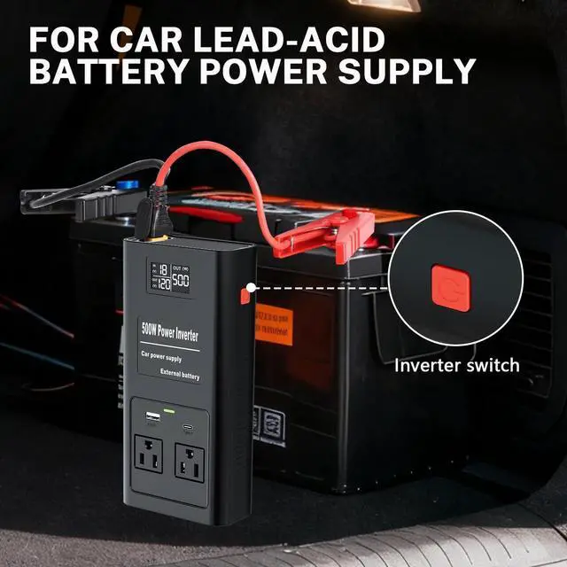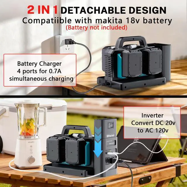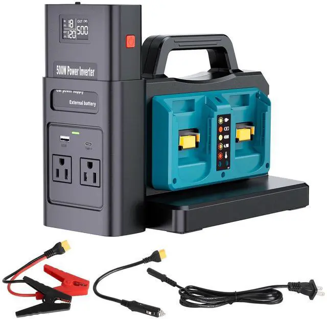 BATTERIES: Battery Power Adapter Doubles your runtime! simultaneously to extend operational runtime by up to 2X, for extended power. Generator Works seamlessly with just one battery too. Your reliable battery power station. (BATTERY NOT INCLUDED, POWER INVERTER ONLY) ^^ ALL-IN-ONE CHARGING HUB MEETS YOUR EXPECTATION: Simultaneously charge up to 4 devices! Features 2x 110V AC outlets (500W peak), USB ports (fast charging), and type-C ports. Perfect for phones, laptops, cameras, small appliances, and more during outdoor adventures or power outages. ^^