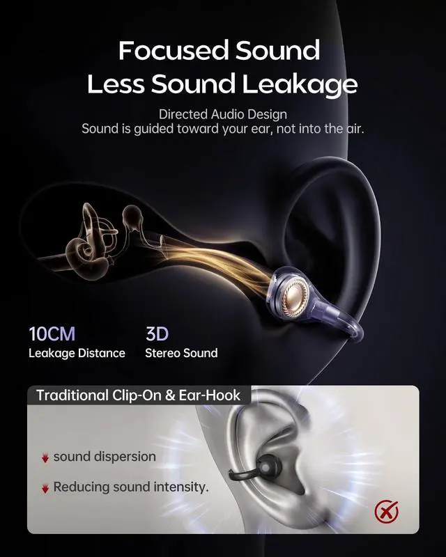 Clip-On Open-Ear Comfort No Ear Pain, No Deep InsertionKinglucky A9 II is designed as clip-on open-ear earbuds with a semi-in-ear structure, resting naturally at the ear canal entranceno deep insertion, no pressure, no soreness. The soft clip gently hugs your ear without squeezing, delivering true all-day comfort for work, commuting, and extended wear. ^^ More Focused Sound Than Typical Open-Ear EarbudsUnlike fully open or leaky clip-on earbuds, the semi-in-ear design directs sound toward your ear canal, reducing sound dispersion and minimizing leakage. Enjoy richer, more focused 3D stereo audio while still staying aware of your surroundingsideal for focused work, study, and quiet office environments.