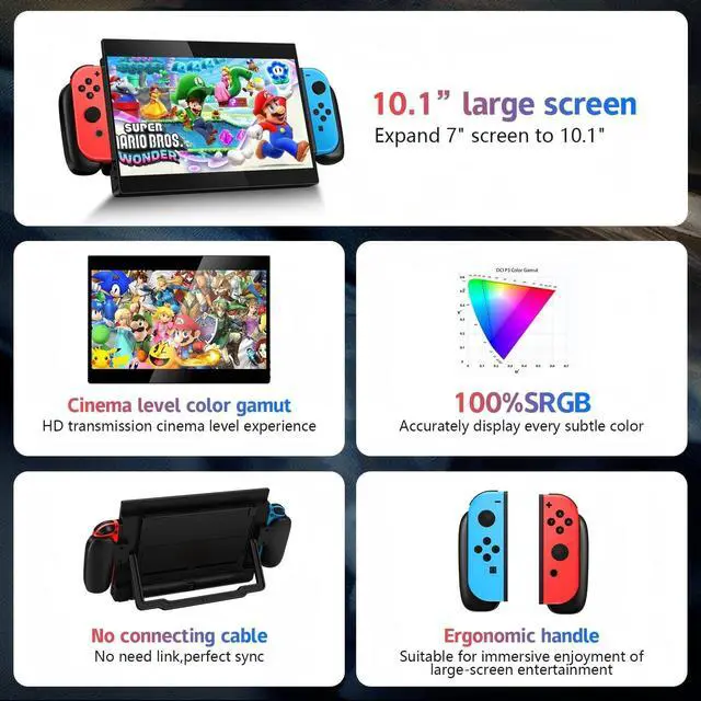 10.1-inch all-in-one portable display: with a 1920x1080P resolution and 16:9 aspect ratio, this portable gaming display, integrated with 2wx2 speakers, enhances the overall gaming experience.