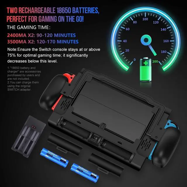 Removable battery pack: You can purchase 18650 batteries x2 separately, allowing you to buy batteries with the capacity that suits your needs. Actual gaming time may vary, please refer to: with the battery at 75% or higher - 2400mA x2: 90-120 minutes, 3500mA x2: 120-170 minutes. Actual usage may vary.