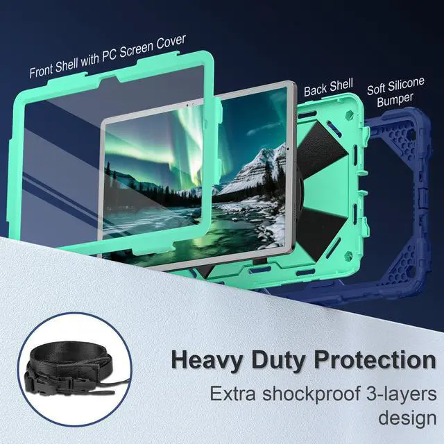 A 3-layer construction effectively protects your Galaxy A9 Plus tablet from accidental drops or slips. with blue protective film on the built-in screen protector, please PEEL it OFF before use ^^ Hands-Free Shoulder Strap Samsung tab A11 Plus comes with a detachable, adjustable shoulder strapessential for technicians, teachers, construction workers, or hikers who need to carry the tablet and keep both hands free for work, holding tools, or climbing. Additionally, you can wrap the strap around a car's headrest to create a makeshift cinema for backseat passengers. It's perfect for keeping kids entertained on long road trips without needing an extra car mount ^^ Elastic Pen Holder Equipped with a compact pen holder for keeping your pen on hand.