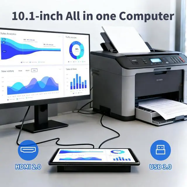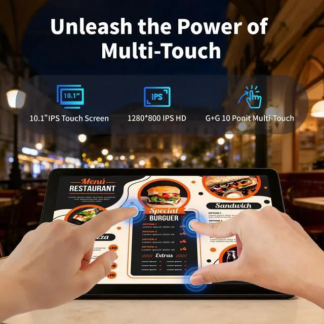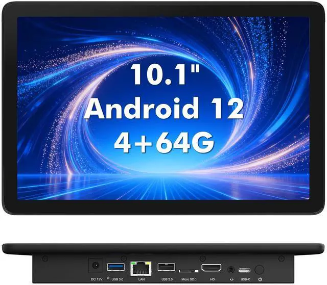 I/O ports: Gigabit Ethernet for fast networking, a legacy RS-232 serial port (DB9) for PLCs and industrial devices, USB 3.0, USB 2.0, and Type-C ports, HDMI 2.0 supporting 4K@60Hz output, and an optional 4G LTE module. It seamlessly connects to all your equipment. ^^ Durable Build with Crisp Touch Display The 10.1 -inch IPS HD display (1280x800) with G+G multi-touch offers wide viewing angles and responsive control. Built to withstand challenging environments, it operates reliably in a wide temperature range (-10C to 50C) and includes a hardware RTC clock, perfect for workshops, restaurants, and retail stores. ^^ Flexible Deployment & Management Supports multiple power-on modes (button or auto-on) with an optional RTC scheduled power on/off feature for automatic operation outside business hours, saving energy. Comes with Android 11 and offers optional Linux 4.19 support (meet MOQ), providing great flexibility for software development and system integration. ^^ Cost-Effective All-in-One Solution This space-saving unit integrates the computer, display, and ports into one compact body (with VESA mount), reducing clutter and total cost of ownership. Ready to use out of the box, it's an ideal and economical choice for digital signage, interactive kiosks, self-service terminals, and light industrial control applications.