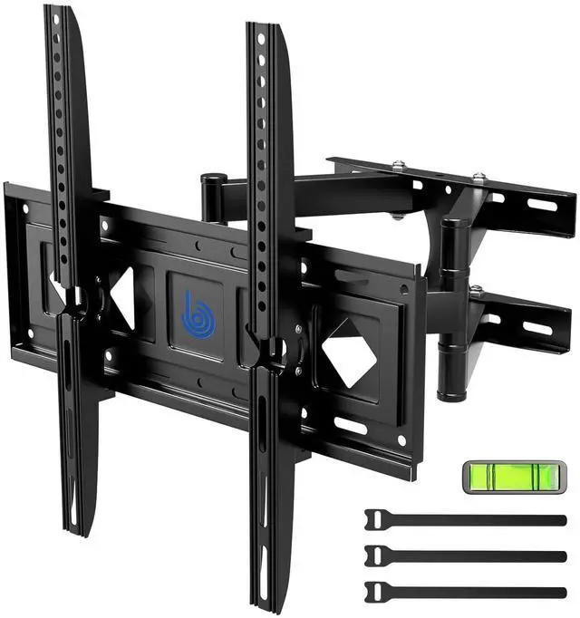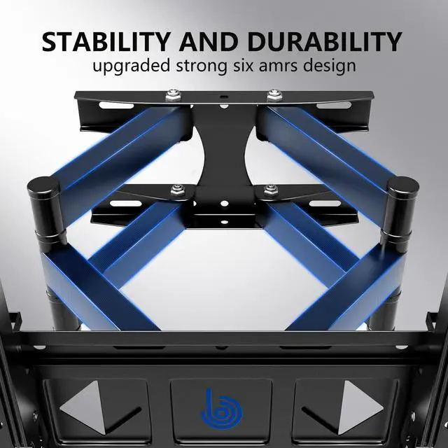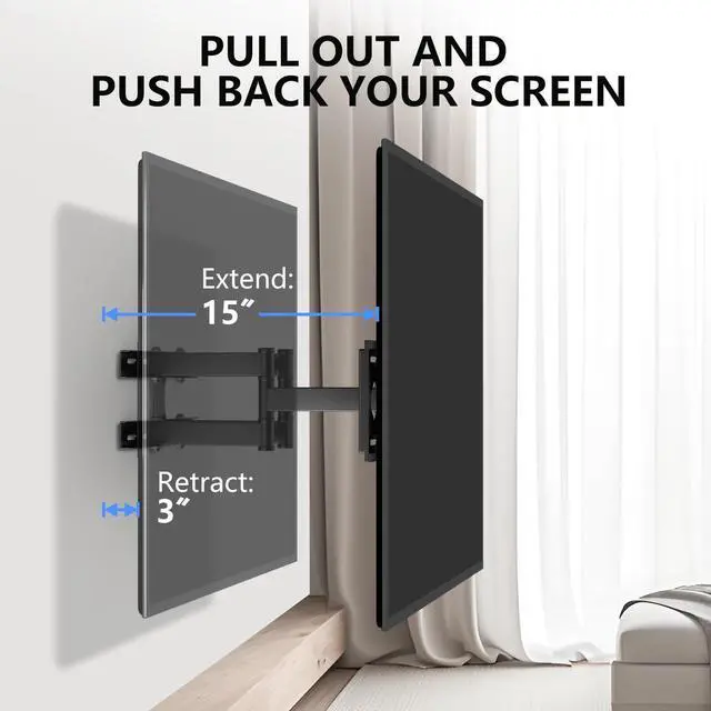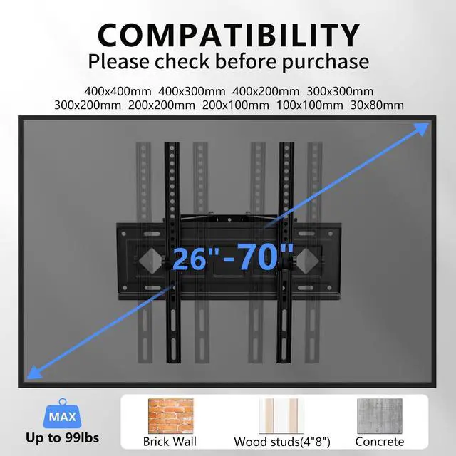 UNIVERSAL COMPATIBILITY Fits most 2670 inch flat/curved TVs up to 99 lbs, with VESA patterns from 75x75mm to 400x400mm. Compatible with 12/16 wood studs, brick, or concrete walls (not for drywall alone). ^^ HEAVY-DUTY & RELIABLE Made of premium reinforced steel with dual articulating arms, this TV wall mount ensures superior stability and safety for your TV. Strong enough to hold securely for years of use. ^^ FULL MOTION VIEWING Enjoy the perfect angle with +10/-10 tilt to reduce glare, 45 swivel for flexible viewing, and 315 inch extension for maximum comfort in any room setup.