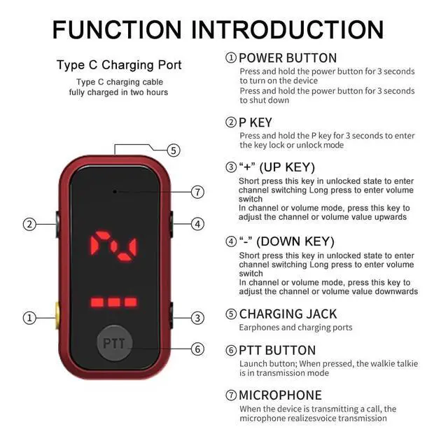 To prevent accidental key presses, a smart security lock is integrated, ensuring that your settings remain unchanged until you're ready to adjust them. ^^ Clear Sound and Wide RangeEquipped with a high - performance speaker and intelligent noise - reduction technology, these walkie - talkies deliver clear and crisp communication. While the transmission range is affected by various factors like weather and surrounding buildings, in an open, flat area free of tall obstructions, you can expect a talking range of approximately 2 miles. ^^ Advanced Type - C ChargingThe upgraded Type - C USB charging design not only speeds up the charging process but also enhances safety.