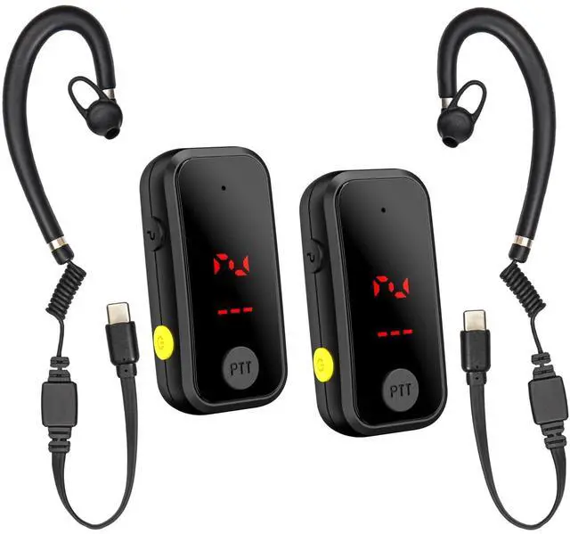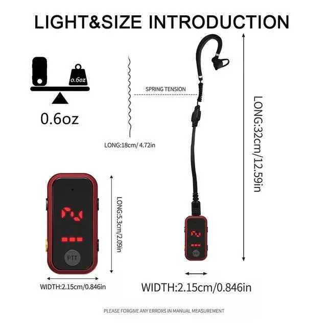 Mini 2 Way Walkie TalkiesOur Mini 2 - Way Walkie Talkies are incredibly small, measuring just L2*W 0.84 *H 0.59 inches and weighing a mere 0.6 oz. Can carry them effortlessly wherever you go. The ergonomic G - shaped ear hook, crafted from soft materials, conforms snugly to your ear, ensuring long - lasting comfort. Plus, the 360 - degree rotatable headset fits both left and right ears, and comes with three different - sized earphone caps for a customized fit. ^^ Intelligent LED DisplayFeaturing a smart LED display, key information such as channel and volume settings, as well as the charge status, is visible at a glance.