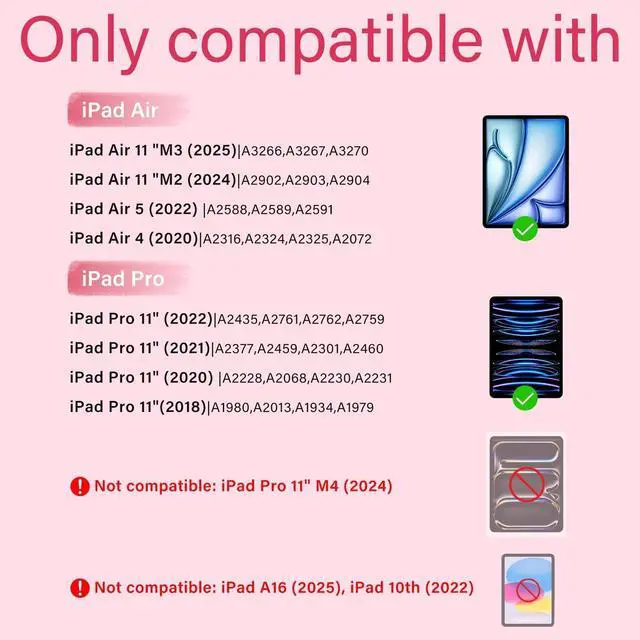 Compatibility: This for iPad 11 inch case with keyboard is perfectly compatible with Air M4 11-inch 2026, iPad Air M3 11-inch 2025 (A3267 A3270 A3266), iPad Air M2 11-inch 2024 (A2902 A2903 A2904), 2022 iPad Air 5th Gen 10.9 in(A2588/A2589/A2591), 2020 iPad Air 4th Gen 10.9 in(A2316/A2324/A2325 /A2072), For 2022 iPad Pro 11 4th Gen (A2435/A2761/A2762), 2021 iPad Pro 11 inch 3rd Gen (A2301/A2459/A2460), 2020 iPad Pro 11 inch 2nd Gen (A2228/A2068/A2230/A2231) &2018 iPad Pro 11 inch 1st Gen (A1980/A2013/A1934/A1979) ^^