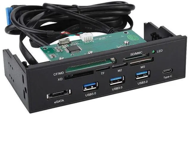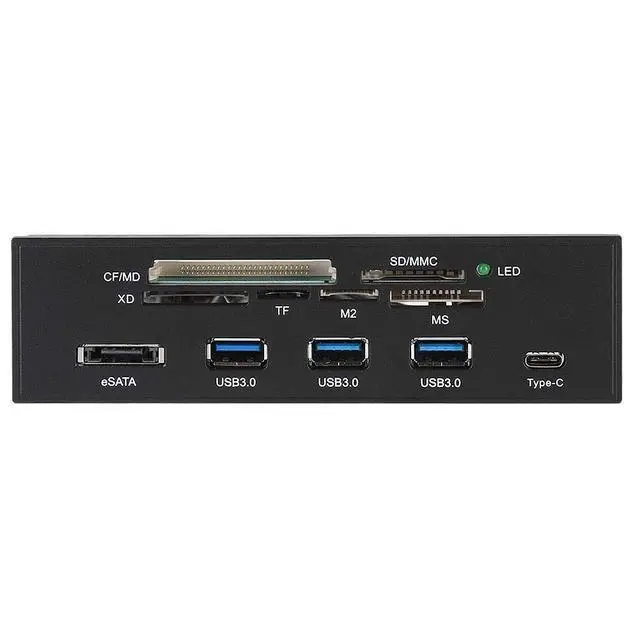 Features: High speed front USB 3.0 interface for an efficient and effortless data transfer. 6 card slots offer quick and easy access to the most common-used card formats, support M2, MSO, SD, MS, XD, 64G CF card. material ensure durability, LED indicator make you keep an eye on work status. Equipped with eSATA and USB 3.1 port to meet your needs. Can be easily and neatly installed into a 5.25" drive bay on your desktop to give you convenient access.