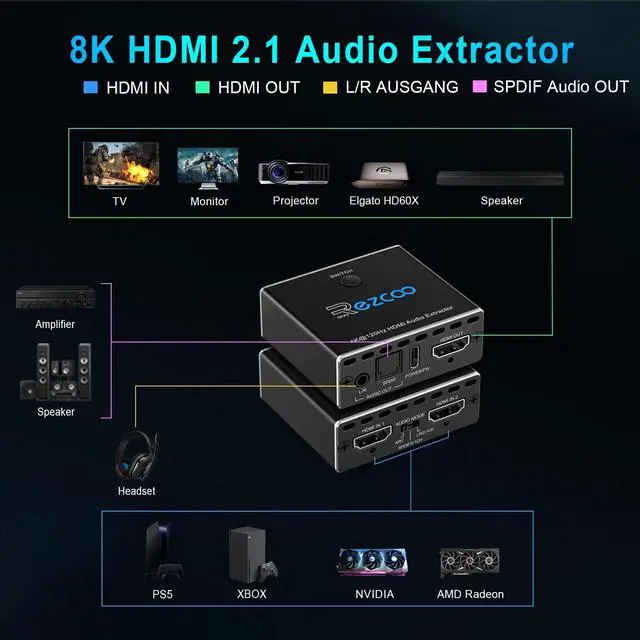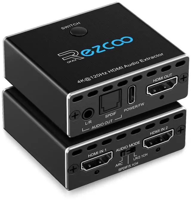 8K HDMI Audio ExtractorEasily switch between two HDMI sources (like PS5 and Xbox) and output video to one display while extracting audio via HDMI ( 7.1CH ), SPDIF Optical ( 5.1CH ), or 3.5 mm stereo (2CH), perfect for soundbars and AV receivers. ^^ Video & Audio FormatVideo Format - Supports resolution up to 8K@60Hz, 4K@120Hz, 1080p@240Hz, 5120x1440@120Hz, 3840x2160@60Hz, 1440p@60Hz, 3D, HDR, Version, HDCP 2.2, HDCP 2.3 bypass, IMAX DIGITAL(2K/4K), 4:4: 4 8bit - Audio Format - HDMI Audio Extractor Converter DE-embed SPDIF Optical Digital ( 5.1CH ) + 3.5 mm L/R Stereo Audio ( 2.1CH ), only HDMI OUT can use Digital 7.1CH, DTS: X, True HD, DTS-HD Master Audio. Soundbar supported. ^^ Easy Usage -- Plug and play. Power supply through type-C connector, connect PS5 and XBOS and other sources to the two input ports with HDMI cable, and then the display to the output port, according to the sound and picture quality you need to mediate ARC mode. Failure to use a cable that meets the specifications will result in unstable image transmission or no image display. ^^ High Compatibility8K HDMI Audio Decoder works perfectly with N-v-i-dia Shield, X-f-inity box, Game Capture, A-pple TV, F-ire TV, PS3/ PS4 Pro, PS 5 X-box series X, desktop audio extract etc; Compacted design for portable, flexible, easy installation. If you encounter incompatibility, you can search for firmware updates on the official website or contact us at any time. ^^ Please Note -- Highly recommend qualified HDMI 2.1 cable less than 10ft / 3m. You can buy B0BB78BFNJ if you need it. Supports only 2 in 1 out, does NOT support 1 in 2 out or Bi-directional. Support automatic switch.