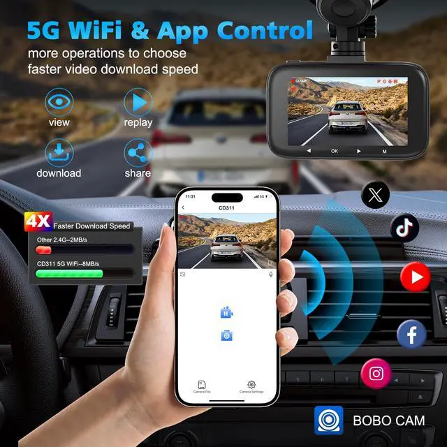 The magnetic design allows you to easily attach and detach the CPL filter as needed. This feature improves the clarity of your recordings by enhancing contrast, reducing windshield reflections, and ensuring that every detail is captured clearly, regardless of the lighting conditions. ^^ 5GHz WiFi & Smart App Control Built-in 5G Wi-Fi, Zhiroad dual dash cam front and rear offers fast and seamless connectivity, allowing you to control and access your footage via a dedicated mobile app. You can view live footage, download videos, adjust settings, and even share recordings directly from your smartphone.