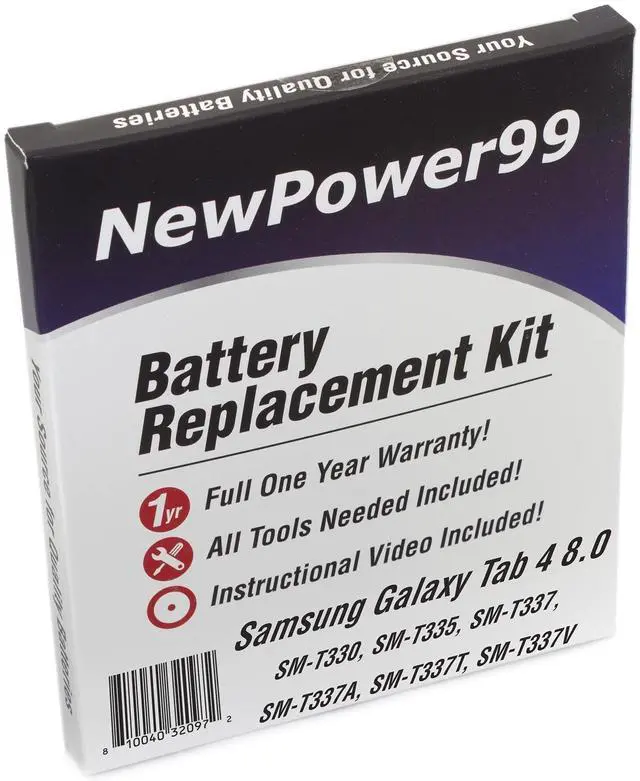 Replace your Samsung GalaxyTab 4 8.0 Battery or Keep an Extra Battery on hand as a backup. This kit comes with a 4450 mAh, Rechargeable Lithium-Polymer Battery, Special Electronics Tools, and Detailed Instructional Video. Works in your Samsung Galaxy Tab 4 8.0 SM-T330, SM-T335, SM-T337, SM-T337A, SM-T337T, SM-T337V Tablets. You get a New Battery, Video Instructions, Special Tools needed for battery installation, and You also get a full One Year Guarantee exclusively when you purchase our Samsung Galaxy Tab 4 8.0 Battery Replacement Kit.