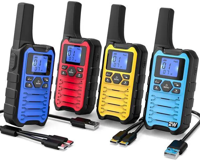 Quick-Pair in seconds Press one key to sync and talk; ideal for classrooms, church ushers, event staff, warehouses and camping caravans. ^^ Clearer indoors with 2W FRS Stronger coverage through halls, aisles and high-rise corridors; switch to a less-crowded channel and add a privacy code to cut cross-talk. ^^ Rechargeable power that lasts Each radio includes 31500mAh AA NiMH; auto battery-save helps support all-day use. ^^ USB-C split charging 1-to-2 USB-C cable charges two radios from one port (power bank, car or wall) for quick top-ups on the go.