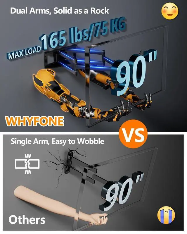 The short-arm TV bracket is only suitable for use in narrow spaces. ^^ 165 lbs Heavy Duty TV Wall Mount This 85 inch TV wall mount has 165 lb capacity picture a muscle-bound gym enthusiast dangling from your screen, and this TV mount wouldn't flinch! Outshines flimsy single-arm TV mount, giving your premium TV fortress. Forged from high quality alloy steel and 3x loading-tested beyond limits! No more worry about your 90 inch TV falling down. ^^ Full Motion TV MountThis 80 inch TV wall mount can tilt up 5 or down 12, level left or right 3.