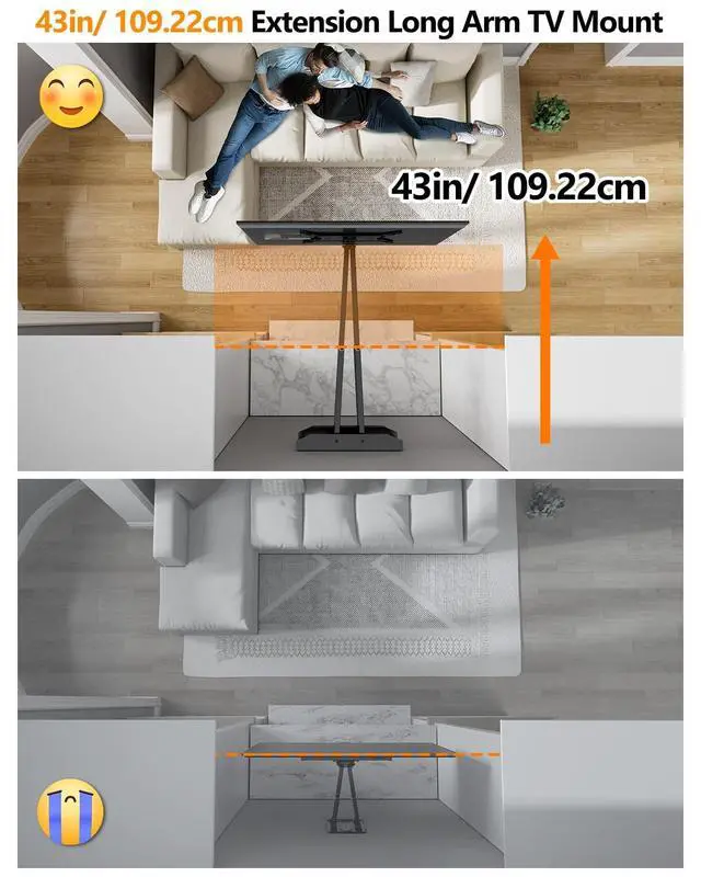 Premium TVs deserve a high-quality mount to match. While it may be pricier, it offers a longer lifespan and eliminates worries about your expensive, large TV falling. ^^ 43 inch Extension Extra Long Arm TV Wall MountThis 43-inch extendable TV mount finds its place in both large domestic and commercial spaces. For instance, expansive villas, spacious outdoor courtyards, and corridors are all ideal for this long extension TV wall mount, as their arm reach ensures a broader view. In commercial settings, such as exhibition booths, hotel lobbies, and hospital wards, these long reach TV brackets are also needed to capture more views, allowing more viewers to enjoy TV.