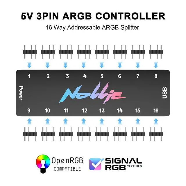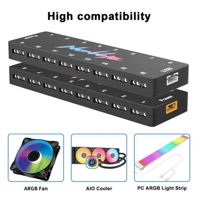 Broad 5V 3-Pin ARGB CompatibilitySeamlessly works with 5V 3-pin ARGB fans, CPU coolers, LED strips, and PC cases. Expands your motherboards ARGB ports to support full-scale lighting overhauls for gaming builds or professional workstations. ^^ Dual RGB Software IntegrationOfficially certified for SignalRGB and fully compatible with OpenRGB. Effortlessly customize colors, sync dynamic lighting effects across all your ARGB gear, and take full control of your entire lighting ecosystem. ^^ High-Load Channel CapacityEach channel drives up to 126 LED beads (around 1, 000 lumens equivalent), easily handling elaborate setups like 16-fan rigs without any performance degradation or flickering issues.