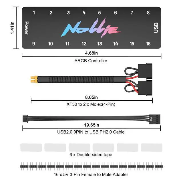 ^^ Stable XT30 to Dual Molex (4-Pin) Power SupplyEquipped with an XT30 to dual Molex (4-pin) power cable for steady power delivery. Eliminates voltage drops even with large lighting arrays, ensuring consistent brightness and effect performance. ^^ Compact, Durable Build & Plug-and-Play SetupCrafted from premium FR4 + PETG in a sleek black finish, this controller measures just 4.65" x 1.42" x 0.43" to fit snugly in tight PC chassis. The package includes the controller, a 19.69 -inch USB 9-pin signal cable, an XT30-to-dual-Molex power cable, 16 adapter pins, and 5 adhesive padsno extra tools required for hassle-free installation.