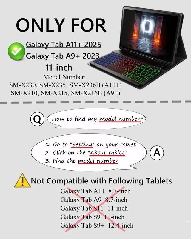 Model CompatibilityDesigned Only for Tab A11+ 2025 & Tab A9+ 2023 11-inch (Models: SM-X230/SM-X236B/SM-X210/SM-X215/SM-X216B/X216R), Not compatible with other models. You can check the model number before purchasing to make sure you get the correct size tablet keyboard case. ^^ Removable Magnetic Dazzle Backlit KeyboardSamsung Galaxy A11-Plus 2025 & A9-Plus 2023 11-inch cases come with a removable magnetic dazzle backlit keyboard. The ultra-thin, lightweight magnetic keyboard attaches securely to the case, helping the tablet stand upright and turn it into a mini laptop in a second. Use the optional Dazzle Backlight mode to choose your favorite light from 6 color combinations and a simple white backlight for smooth typing in the dark, even when working at night. ^^ Adjustable Viewing Angles and Support for PenCase supports 3 viewing angles and has anti-slip slots. Move the tablet forward or backward along the case to choose a suitable angle to use the tablet for writing, viewing, reading, drawing, etc. Built-in Pen holder makes it easy to carry the Pen with your device.