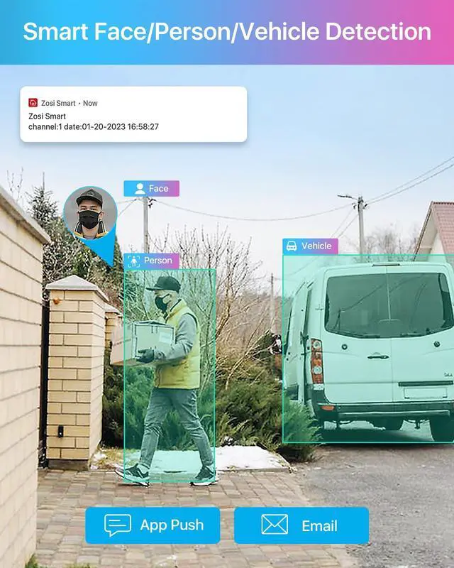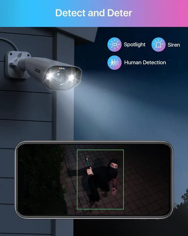 PoE NVR models: ZR16HB, ZR08HN, ZR08SN, ZR16SK, and ZR16HK. It is not compatible with non-ZOSI PoE NVRs or any ZOSI DVR systems. For optimal performance, it is recommended to keep your ZOSI Smart App and ZOSI PoE NVR updated to the latest version. Watch the video first for step-by-step instructions before installation and mounting. ^^ 4K Ultra High Definition & Color Night VisionThe resolution of this PoE IP security camera is 1.6X clearer than 5MP and 4X clearer than 1080P. Record everything with sharper details. Equipped with 4pcs IR LEDs and 2pcs spotlights, support 100ft starlight night vision. ^^ Person Vehicle Detection & Instant AlertsWith AI detection, ZOSI smart security camera can more accurately detect person and vehicle, and you can custom the alerts specific areas to reduce unnecessary notifications. This surveillance camera equips with a siren and spotlight as a deterrent, reacting to any potential danger. ^^ IP66 Weatherproof This outdoor indoor dome camera boasts a durable design that is IP66 weatherproof for years of reliable outdoor use, even in harsh weather conditions. ^^ Two-Way AudioWith a two way audio function, not only can hear but also allows you to have real-time conversations like talking on a phone with your family members or warning intruders even if you are far away from home.