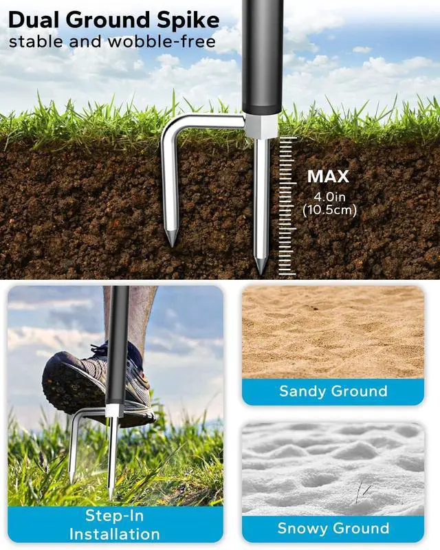 Stable and DurableThe golf tablet stand features a dual ground spike design, ensuring stability on grass, dirt, snow, and sand. Perfect for golf swing analysis, putting records, and sports training at football fields and outdoor venues. ^^ Flexible AdjustmentsThe tablet tripod mount supports 360 rotation and 90 tilt, allowing for various angles. Ideal for recording swings, training sessions, vlogs, and family gatherings. ^^ Adjustable HeightThe monopod selfie stick features a 7-section telescopic pole that extends from 12.5" to 57", offering various heights for video capture.