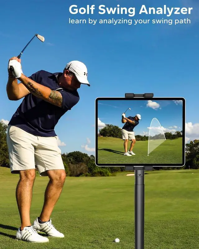 Made of durable, lightweight aluminum alloy, it is perfect for outdoor conditions. ^^ Portable & Easy SetupThis golf swing tablet holder weighs 16.5 oz and comes with a travel storage bag. Simply step on the crossbar to push the ground spike into the ground for quick installation. ^^ Wide CompatibilityThis monopod tablet holder supports 4.7" - 13" tablets and phones, including iPad Pro, iPad Air, Galaxy Tabs, and iPhone. The strong clamp ensures a secure hold, even with cases.