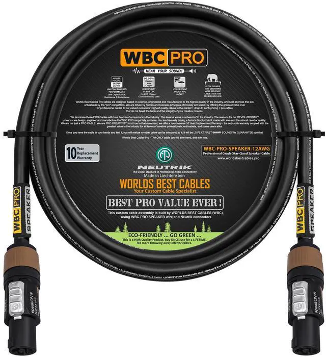 These high-value, high-quality cables will not break your bank and the integrity of your creative process. With WBC-PRO you are buying a product made with love and the utmost care for quality. WBC-PRO, the only cable you will ever need! ^^ The brand of connector used for this cable assembly: NL2FXX-W-S is the latest & the highest-end two-pole SpeakON offering by Neutrik AG- Liechtenstein, the world's leading brand for professional audio connectors. It sports a reliable twist-locking system, thermoplastic housing & Silver-plated Copper-alloy connectors. Offering the most reliable loudspeaker connections, the plugs can support 6mm to 12mm wide cables & have an IP20 rating. ^^ All our cables are professionally soldered using WORLDS BEST CABLES proprietary 4% silver solder blend & a nitrogen-assisted soldering process unique to us, exceeding industry standards, improves integrity of solder joints over traditional methods. ^^ These cables are lovingly assembled by WORLDS BEST CABLES, we offer the largest array of custom-built cables in the market, we carry all the major cable and connector brands. We have served millions of customers with quality assemblies for many years - this sale is for a single 6 Foot long cable.
