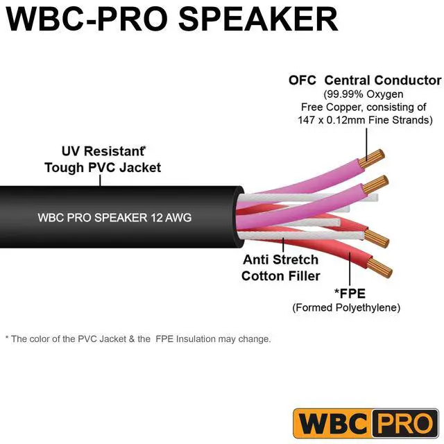 WBC-PRO-SPEAKER-12AWG, Star-Quad (eliminates EMI noise), Ultra-flexible, Professional-grade cable is a top-of-the-line solution for super-durable speaker cables. Low Capacitance & Resistance are ideal for long cable runs while still delivering Higher-Highs and Deeper-Lows. The cable sports 147 x 0.12 mm High-Purity ( 99.99 %) Oxygen Free Copper (OFC) Strands per Core. Suitable for even the most demanding situations (UV Protected Tough PVC Jacket) & superior to Industry leaders like Canare 4S11. ^^ WBC-PRO cables are designed based on science, engineered & manufactured in-house to the highest quality in the industry, and sold at prices that are unbeatable by the pro competition.
