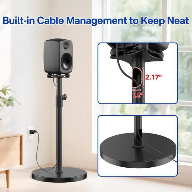 ^^ Cable Management - Our speaker stands has a built-in cable management design that easily routes and hides charging cables, clutter-free look that keeps your space tidy. It also ensures that your speakers are always charged, making them more convenient to use. Blends functionality with neatness. ^^ Robust Support - Our stand for speaker are made of quality metal and a thicker base that holds up to 15Lbs. Even with frequent daily use or when the volume is turned up high, the speakers ensure that they are securely placed and won't accidentally slip out of place and cause damage to the speakers.