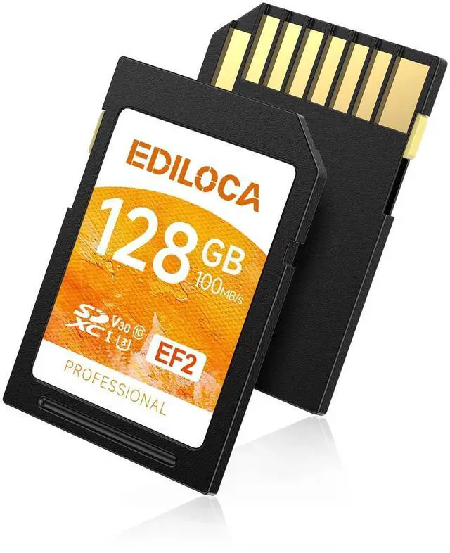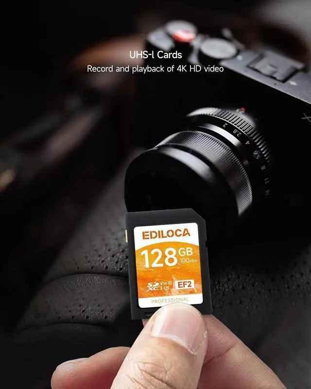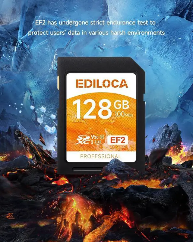 BRIEF INTRODUCTIONDesigned for professional bloggers, filmmakers, photographers and content creators, the 128GB UHS-I Memory SD Card helps you achieve excellence in photography and video creation. ^^ READ/TRANSFER SPEEDThe EF2 SD card, 100 MB/s read/transfer speed and 90 MB/s write/shot speed. For continuous burst mode shooting and cinema-quality video recording, Supports recording Full-HD & 4K videos with Video Speed Class 30 rating. (1 GB = 1, 000, 000, 000 bytes. Actual user storage may be less. ) ^^ WATERPROOF AND SHOCKPROOFThe EF2 memory card is rigorously endurance tested to be waterproof, shockproof, X-ray proof and resistant to extreme temperatures.