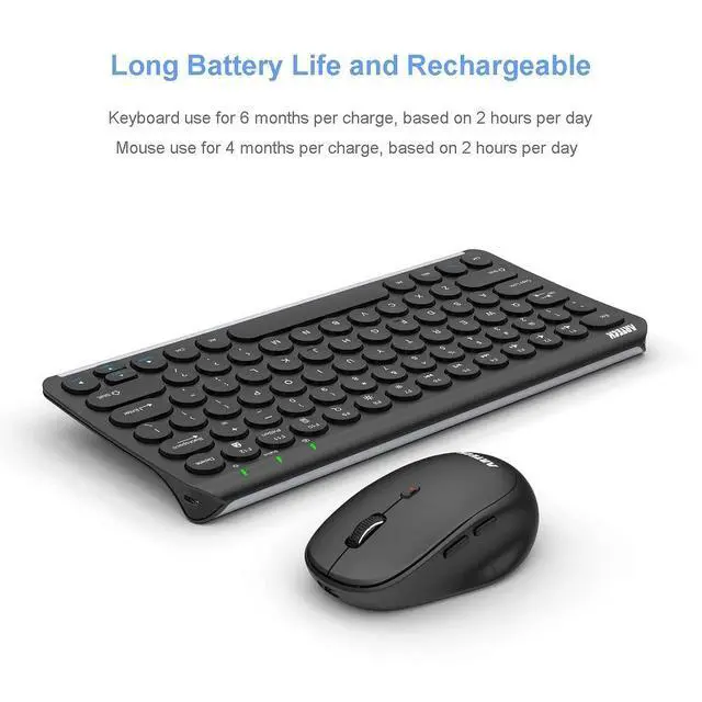 The Keyboard and mouse will work up to 33 feet or 10 meters. It allows you to gain quick access to common functions, such as volume level, playback control, brightness, and more. Comfortable, quiet typingThe whisper-quiet, low-profile keys bring a whole new level of comfort to your fingertips. What's more, keep all your most-used functions and media controls closer than ever Windows-dedicated hot keys. The construction of this scissors-kick keys can be used more than 3 million times continuously. Rechargeable BatteryBuilt-in industry-high rechargeable Li-polymer battery provides 6-month for the keyboard and 4-months for the mouse use on a single charge.