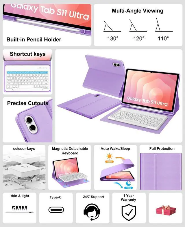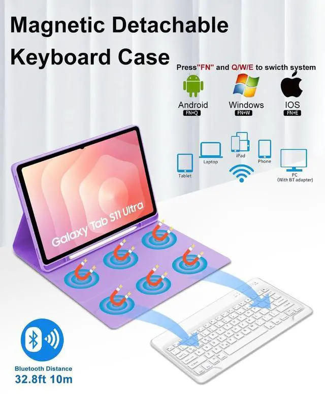 Magnetic Detachable Wireless KeyboardThe samsung galaxy tab s11 ultra keyboard and case are magnetically detachable, which means the keyboard or case can be used alone, ultra-strong magnetism makes the keyboard securely attached to the protective case while typing. Equipped with multimedia