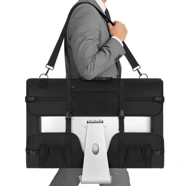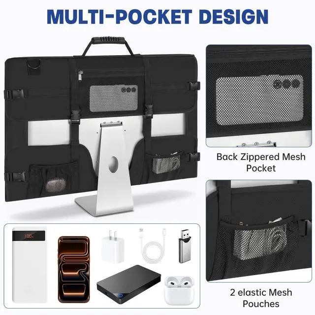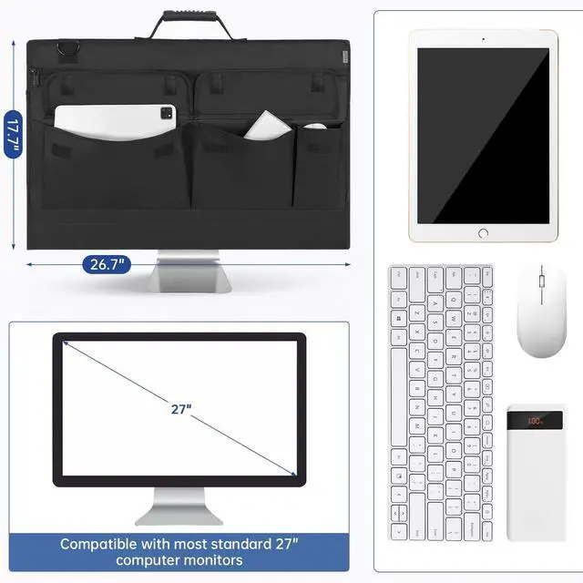 Multiple Pockets and Large Space The monitor bag has 6 extra pockets, which can store all your computer accessories, such as keyboard, mouse, trackpad, USB power adapter, charging cable, headphones, mouse pad, power cord, external Hard drives, CD-ROM drives, etc.