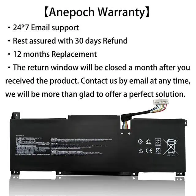 Note: 1. Before placing your order, we highly suggest you to open the back case of your latptop and check out the exact part number of your laptop's original battery. 2. Discharge the new battery use to 5%(not to 0%) and then charge to 95%, and cycle 3-4 times. 3. Do not disassemble, crush or puncture. Do not dispose of in fire or water. 4. If you remove battery for a long time, charge more than 80% at least one time within one months. 5. Don't connect adapter for a long time while using the battery. It may damage the battery. 6. When using the battery, care should be taken to prevent exposure and moisture. C