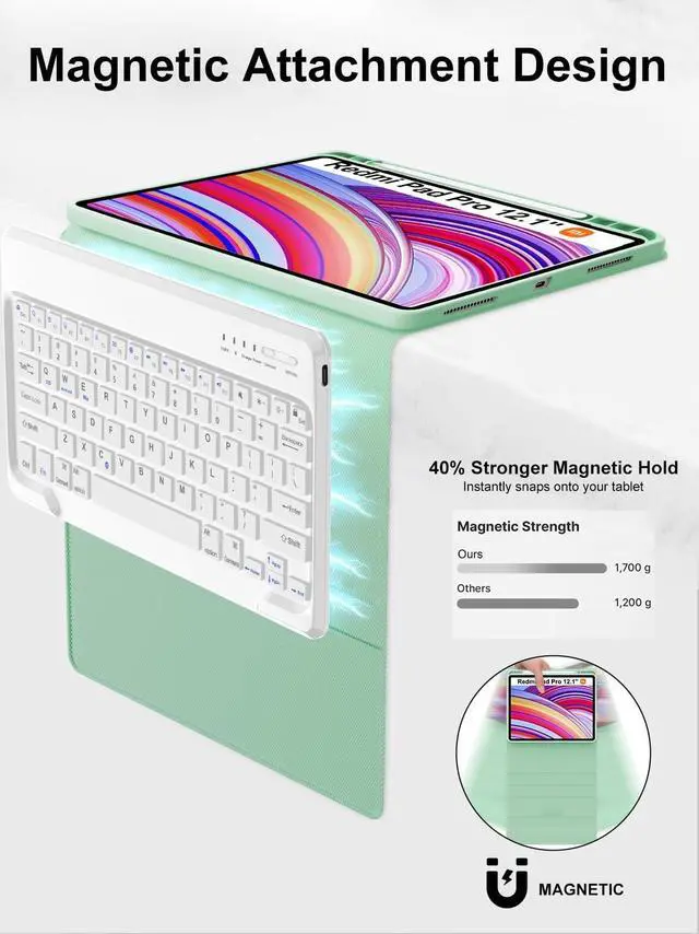 Turn your xiaomi tablet redmi pad pro into a laptop in one second, perfect for studying, working, writing, painting, reading or watching videos ^^ Precise Cutout & Full Body ProtectionThis 12.1 inch case with keyboard for xiaomi tablet redmi pad pro is made of good quality PU leather. Soft, smooth and it gives a luxurious feeling. The interior built-in protective shell is made of high-quality flexible TPU with honeycomb grid design, better for heat release and anti-skid, effectively extending life of your tablet. Precise cutout allows full access to all ports, sensors, speaker, microphone and camera ^^ Stable Bluetooth Connection & Long Battery LifeConvenient and fast Bluetooth connection allows you to use the keyboard anywhere, anytime.