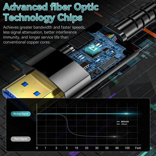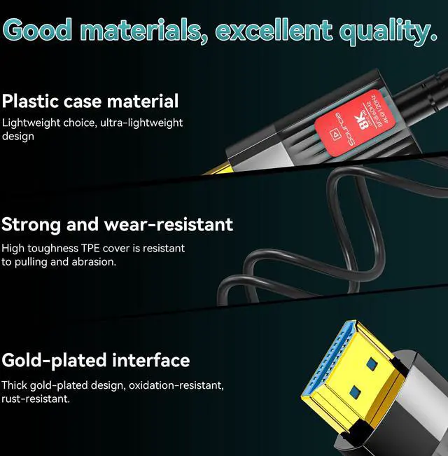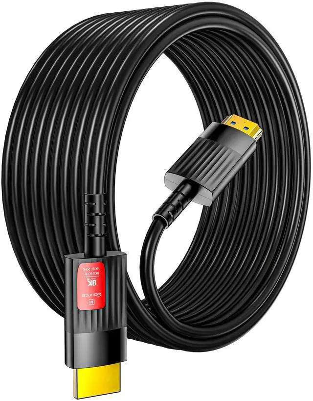 8K Fiber Optic HDMI cable Fiber Optic hdmi cable built with gold-plated connectors, and top chips to ensure high-speed and flawless signal transmission, supports 8k@60hz 4k@120hz (resolution up to 7680*4320), 3D, Dynamic HDR, 4:4: 4 RGB, HDCP 2.2 & 2.3. and adds enhanced audio return channel (eARC), provides high-definition audio quality. Enjoy full HD crystal-clear TV sound quality while experiencing deep colors and high-resolution images, Provides you the best visual experience of ultra high definition. ^^ Enhanced Gaming ExperienceCompared to 4K hdmi cable, 8K Fiber Optic hdmi cable supports 48 Gbps of bandwidth, Transmit audio, video and photos at lightning speed without having to wait for buffering. Plug and play without preinstalling drivers. and also supports variable refresh rate (VRR), solves the problem of picture freeze and tear, making the game more smooth. this 8K Fiber Optic HDMI Cable is the only hdmi cable youll need for the next 10 years. ^^ High quality & DurableHDMI 2.1 fiber optic cable Equipped with the most advanced fiber optic technology, it is the future direction of wire by achieving greater bandwidth and faster speed, less signal attenuation, better interference immunity, longer service life and higher carrying capacity than traditional copper cores, while being thinner and lighter and flexible. Long HDMI cable is the best choice for home renovation, reducing the cost of changing cables due to future demand increases.