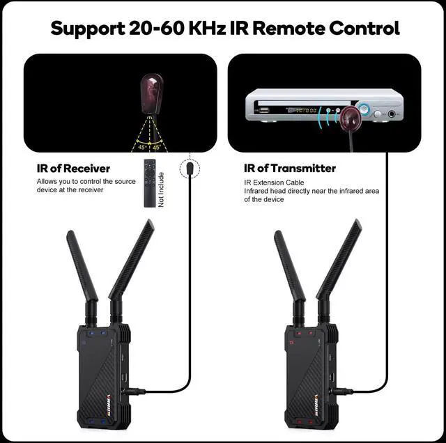 Plug and Play, Loop Out and IR Remote ControlSetup is quick and easy, no software to install, eliminating cable clutter and truly plug and play. Connect the transmitter to the HDMI source, then connect the receiver to the external HDTV and you're ready to go. It allows the source device to recognize remote commands; you can use the included IR cable to control the HDMI source device from an auxiliary location (typically where the HDTV is located) for added convenience. The additional HDMI output on the transmitter side allows you to add a local monitor for monitoring ^^ 1080P ResolutionThe input/output resolution of wireless HDMI transmitter and receiver supports up to Full HD 1080p @60Hz, the image is clear and stable, very smooth and colorful, the sound quality is high and no noise.