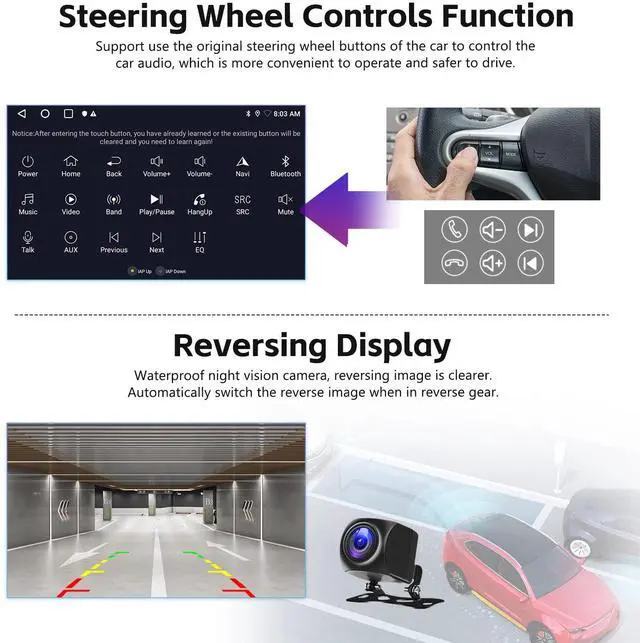 ^^ Steering Wheel Control Function, Backup CameraSupport use the original steering wheel buttons of the car to control the car audio, which is more convenient to operate and safer to drive. Waterproof night vision camera, reversing image is clearer. Note check the radio backup camera resolution. Set camera resolution to AHD 720/25fps in Factory Settings.
