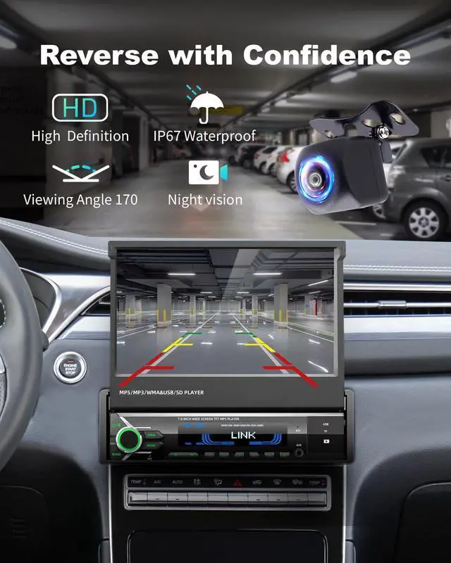 [Rock-Solid Motorized Flip-Out Screen ^^ 3X Lifespan & Anti-Vibration] Say goodbye to wobbly, flimsy screens. Our Single Din Car Stereo features a heavy-duty servo motor and dual-track system, rigorously tested for 30, 000+ cycles to deliver 3X the impact resistance of manual models. The brilliant 7-inch HD capacitive touchscreen stays perfectly stable on rough roads, ensuring a shake-free view. Plus, with Mirror Link, seamlessly display your smartphone's navigation and entertainment apps for a smarter drive. ^^ [True Wireless CarPlay & Android Auto] Experience instant, zero-lag connectivity with Wireless Apple CarPlay and Wireless Android Auto, powered by advanced 2.4G +5G Dual-Band WiFi for a rock-solid link.