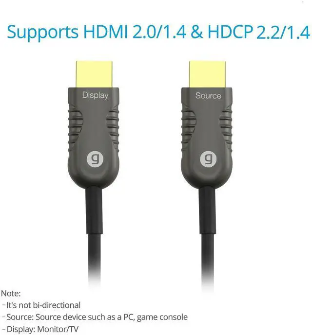 4:2: 0. Immunity to EMI/RFI interference crosstalk and voltage surges. No signal loss in high noise enviroments ^^ LIGHT & FLEXIBLE/LOW POWER CONSUMPTION Slim and flexible cable with only 20 mm minimum bending radius for easy installation in tight areas. 4 core OM3 Multimode Fiber Cable with metal HDMI connectors. Low power consumption of 250mW (max) ^^ ONE-WAY LONG DISTANCE TRANSMISSION This cable is not a bi-directional. The Source HDMI connector is for source devices (such as a PC, Blu-ray player, game console), and Display HDMI connector for monitors, TVs, projectors ^^ FCC, CE & RoHS compliant Our products are backed with a 1-year limited warranty and experienced tech support team in Silicon Valley. If you have any questions or concerns, visit our gofanco website or click on our name in the buy box and select "Ask a Question".
