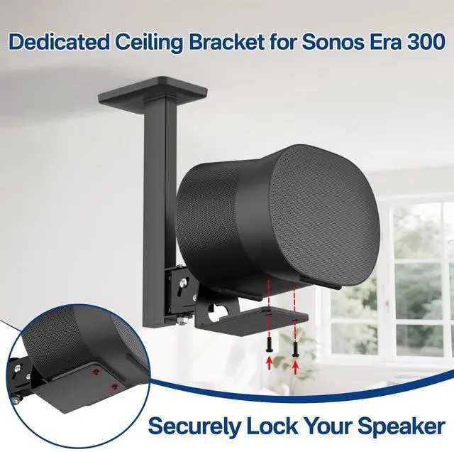 Perfect for Sonos Era 300 - This ceiling speaker mount is specifically designed for Sonos Era 300, no need to worry about compatibility issues anymore. And our ceiling mount bracket for era 300 features dedicated bottom-fixing screws to securely lock your speaker in place, provide extra security for your valuable speakers. ^^ Tilt & Swivel Adjustable For the Sonos Era 300 ceiling mount bracket offers 90 swivel and +15/30 tilt for customized audio projection. Whether youre creating Dolby Atmos immersion in home theater or optimizing acoustics in studio, this flexibility ensures the best sound performance in any listening environment.