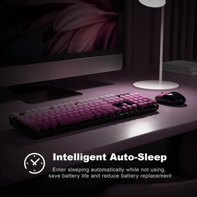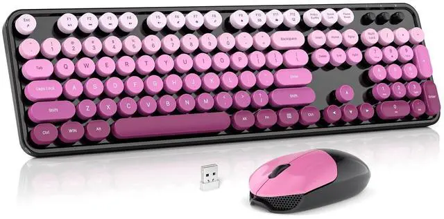 Wireless Keyboard and Mouse Combo, MOWUX Full Size Typewriter Retro Round Computer Keyboard, Cute Optical Mouse Wireless, Plug and Play, for Laptop, PC, Computer-Black Pink Gradient