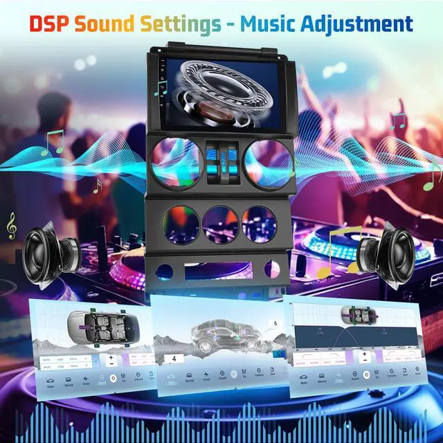 Wireless CarPlay & Android Auto: For Jeep Wrangler radio embrace convenient connectivity with wireless CarPlay and Android Auto. Seamlessly pair your iPhone or Android device to access navigation, stream music, and make hands-free calls directly from the radio's screen. Say goodbye to messy cables and keep your dashboard organized. ^^ DSP Sound Processor and