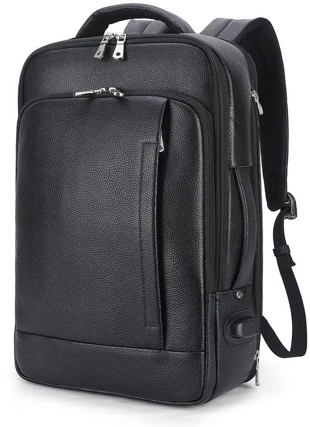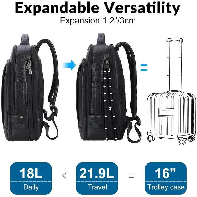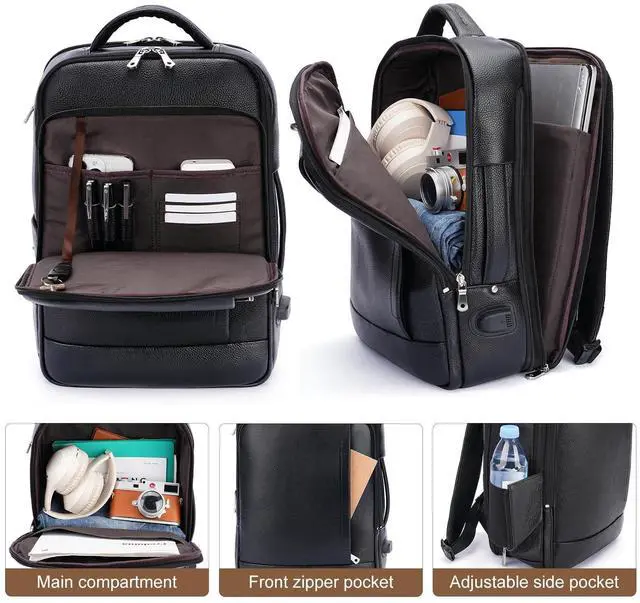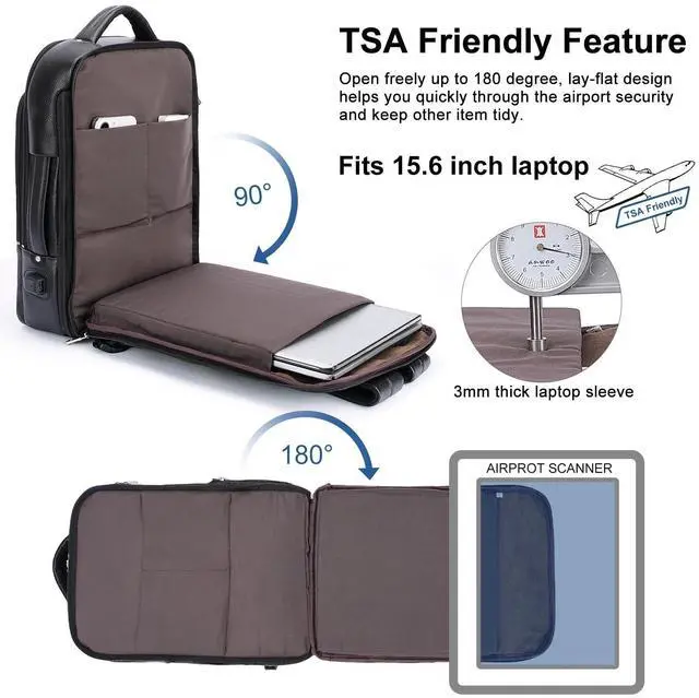 Durable and ComfortableMade of 2mm thick cowhide leather, tear-resistant polyester, and smooth YKK plastic zippers, ensuring it will last for decades. The leather finish is smart and grainy, not shiny, making it resistant to scratches. The padded shoulder straps and back ensure that the weight is distributed evenly, making it feel comfortable even for extended wear. ^^ TSA Friendly & Built for Business TripsThis carry on leather backpack fits under the seat or in the overhead bin. It unfolds 180 degrees flat for easy airline scanning, allowing the laptop to remain in its protective compartment.