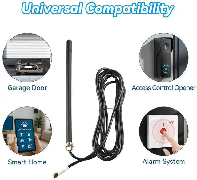 ^^ Broad Compatibility with 433MHz SystemsSpecifically tuned for the 433MHz band, this 433mhz remote antenna is universally compatible with a vast range of wireless devices. It perfectly works with major garage door opener brands (Compatibility with GTO, Mighty Mule, LiftMaster, Ghost, ALEKO, CO-Z, TOPENS, ect) and is ideal for smart home hubs, sensors, and other 433MHz equipment. ^^ Optimized for Reliable Smart Home & IoTBeyond gate openers, this external antenna is an excellent upgrade for enhancing 433MHz smart home ecosystems. It improves signal strength for home automation hubs (like Fibaro), Raspberry Pi projects, wireless sensors, and IoT modules, ensuring stable communication for your connected devices.