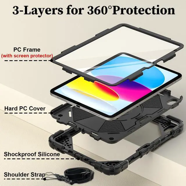Layers Construction: 3 Layers structure of iPad 10th generation case made of Hard PC and Flexible Silicone, Military Grade Material provides tablet comprehensive protection. 4-5mm convex lip of the lens for Camera Len, Anti-Scratch, Anti-Fingerprint, Shock-Resistant ^^ 360