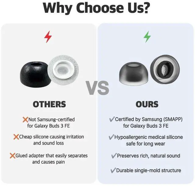 • SMAPP-Approved for Perfect Compatibility Officially approved by Samsung Electronics (SMAPP), these earbud replacement tips are engineered to fit Galaxy Buds 3 FE securely and precisely without loosening or slipping.