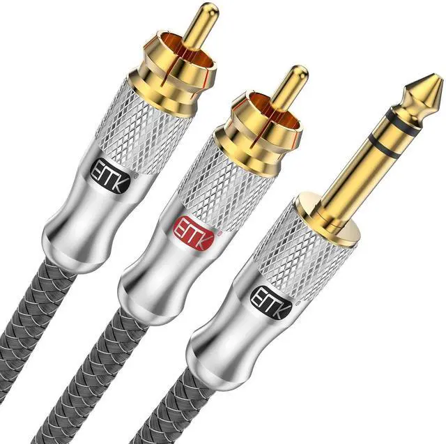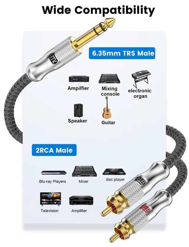 ^^ Superior Sound Experience: Experience high-quality, natural, and pure audio tones with our 6.35 mm to Dual RCA Cable. It splits stereo audio signals into left and right channels, delivering pristine sound quality without any signal loss or distortion.