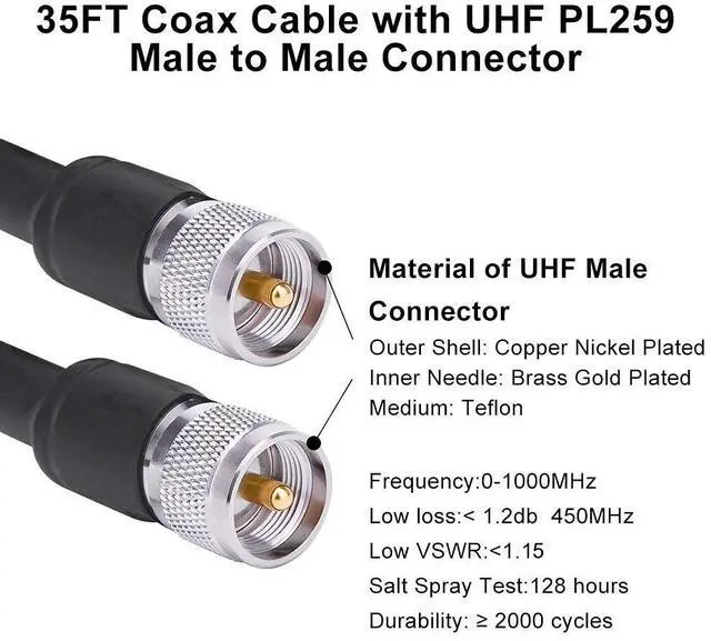 ^^ Durable: The jacket of this cb cable is made of high-quality PVC, which is waterproof and durable. The shell of the uhf connector is made of copper nickel plated, which could be better in resist oxidation and corrosion. The shrink tubing of this pl259 coax cable is built with an adhesive inner wall, sealing against moisture and water or other contaminants. It is very sturdy to work well in outdoor extreme weather.
