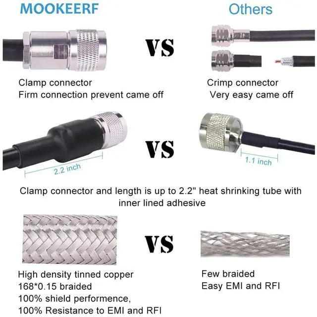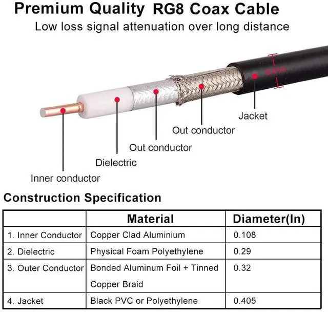 ^^ Well Built Structure: The inner conductor of this pl259 cable is made of copper clad aluminium, and the outer conductor is made of Aluminum foil and tinned copper braid which could maximum protect the signal over large distance. This RG8 coaxial cable is equivalent to lmr400 and rg8u. ^^ Prevent Fall Apart or