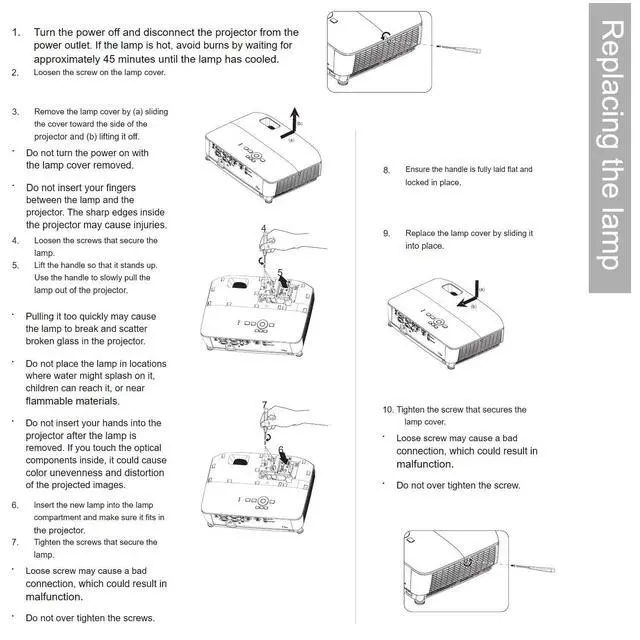Install Your Projector Lamps: To install a projector lamp with the housing, just follow the easy steps below: 1. Make sure the projector is unplugged and sitting on a flat surface2. Loosen the screw holding the projector lamp module cover in place and remove the panel3. Unplug the old projector lamp and remove it from the projector4. Plug the new projector lamp securely into place5. Attach the panel back onto the projector and tighten the screw